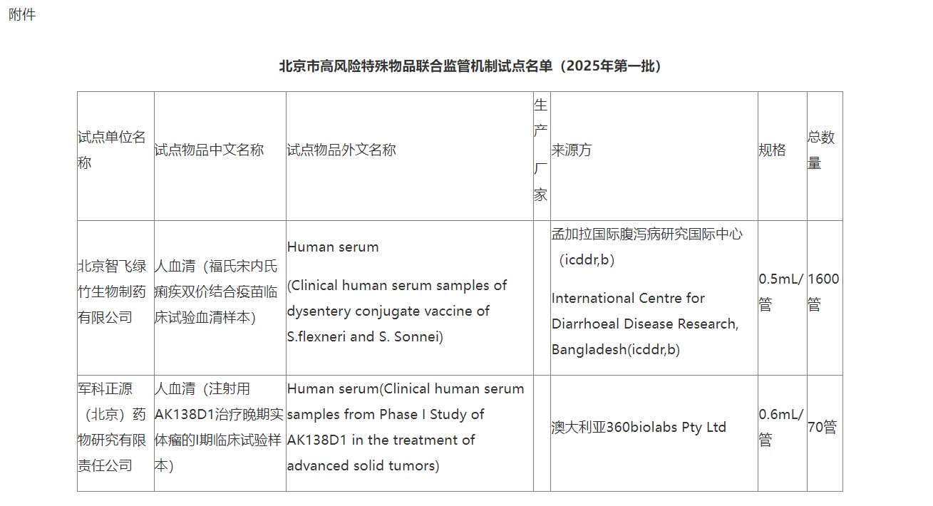 根据《北京市高风险特殊物品入境联合监管机制工作试点方案》(京药监发〔2024〕264号,以下简称《试点方案》)规定,经生物医药企业申报,北京市高风险特殊物品入境联合监管工作小组成员单位联席会议共同确定,现公布北京市高风险特殊物品联合监管机制试点名单(2025年第一批)。